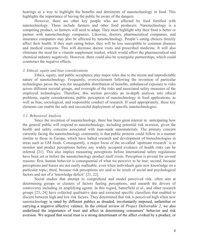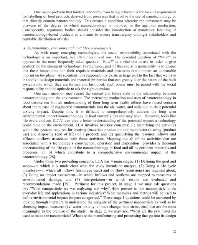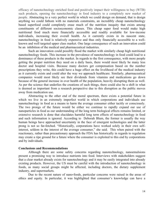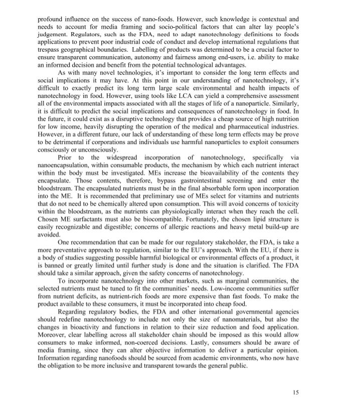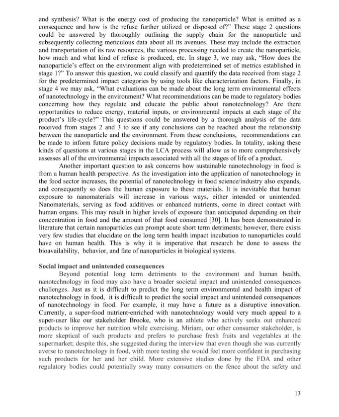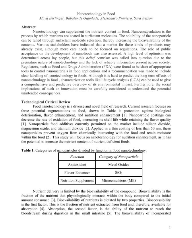 This project investigated recent developments of nanotechnology in the food sector to understand the effects nanoparticles will have on human health and to propose a safe method for their implementation in food. Additionally, multiple stakeholders were interviewed to understand how consumers form opinions on products and to design a method to positively shape their opinion of nanotechnology in food.