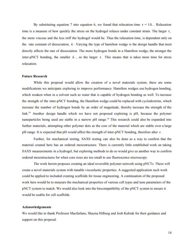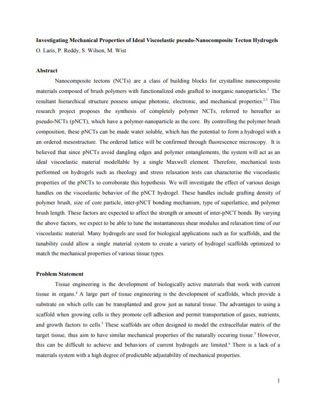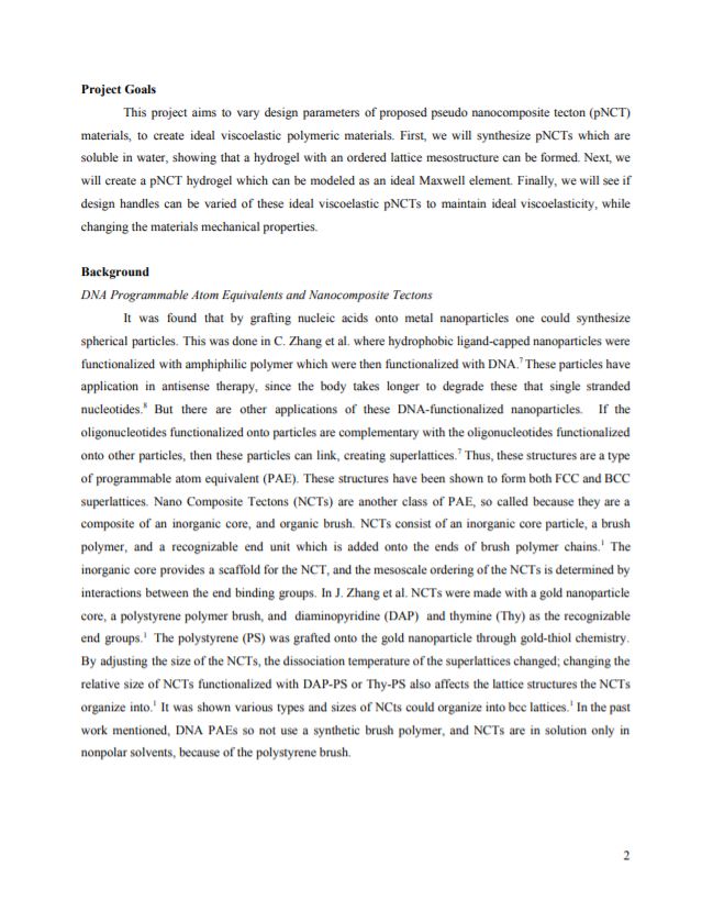 This project proposed pseudo-Nanocomposite Tecton (pNCT) materials, in which ideal viscoelasticity can be achieved in a polymeric system by tuning specific design handles. We designed a synthetic protocol for pNCTs, which are soluble in water, showing that a hydrogel with an ordered lattice mesostructure can be formed. We proposed characterization methods to quantify the mechanical behavior of the pNCT hydrogel and modeled it as an ideal Maxwell element.